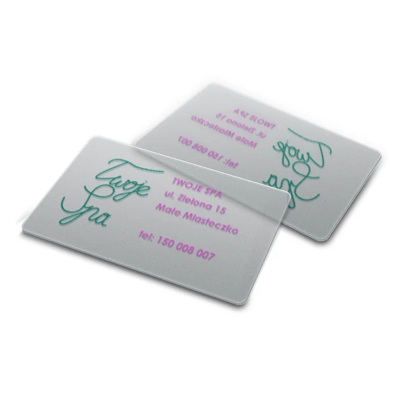 Genomskinliga PET-kort: material Tu-PET (Politereftalan etylenu , polyester), genomskinlig, tjocklek 0,5 mm