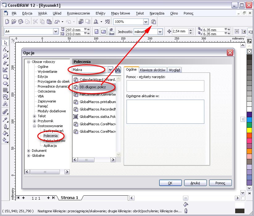 Enligt de markerade fälten på bilden ovan väljer vi från listan över alternativ Kommandon, sedan från rullgardinsmenyn väljer vi Makron. På listan över tillgängliga moduler hittar vi makrot DD.dlugosc.policz. För att lägga till en knapp med vårt makro till listan över knappar bör du "dra med musen" det valda makrot till knapplisten och släppa det där. (röd pil på bilden)