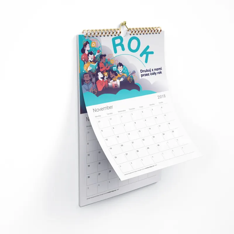 Våra spiralbundna kalendrar (hängande) är ett praktiskt och estetiskt sätt att presentera varumärket året runt. Tack vare högkvalitativt utförande och möjlighet till anpassning utgör de en utmärkt bärare av informativa och reklamrelaterade innehåll. Varje kalender är inbunden med en hållbar Zip-Wire-spiral med vit upphängning, vilket möjliggör enkel upphängning på väggen. Vi erbjuder 13-bladiga och 7-bladiga versioner – båda varianterna möjliggör anpassning av kalendern efter individuella behov och preferenser.